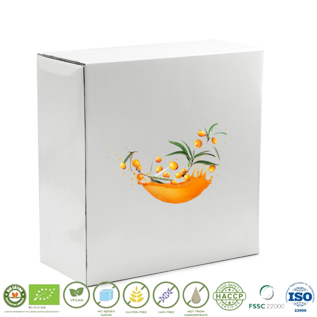20 % suc de cătină ECO (Hippophae rhamnoides L.), apa, sirop de agave ECO